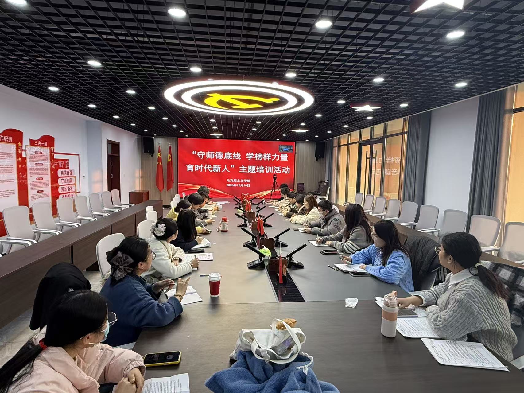 为进一步加强教师队伍师德师风建设,引导广大教师自觉践行《新时代高校教师职业行为十项准则》,明确职业行为底线,提升教师职业道德素养和责任担当意识,12月10日,马克思主义学院组织开展“守师德底线 学榜样力量 育时代新人”主题培训活动。学院全体教师参加培训,活动由马克思主义学院院长冯莹主持。