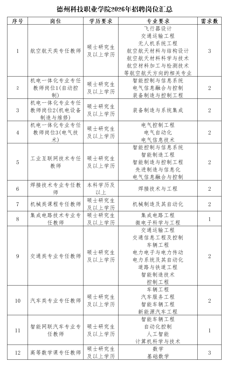 德州科技职业学院2026年招聘简章