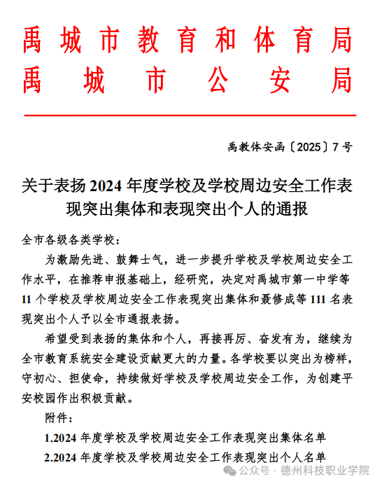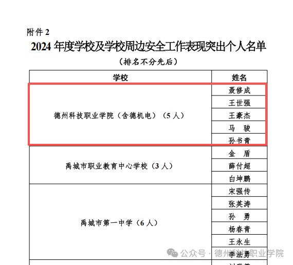 日前,禹城市教体局、公安局联合发布《关于表扬2024 年度学校及学校周边安全工作表现突出集体和表现突出个人的通报》,经推荐申报、层层筛选,孙书青等5名教师凭借在校园安全管理中的突出表现,荣获2024 年度学校及学校周边安全工作表现突出个人。
