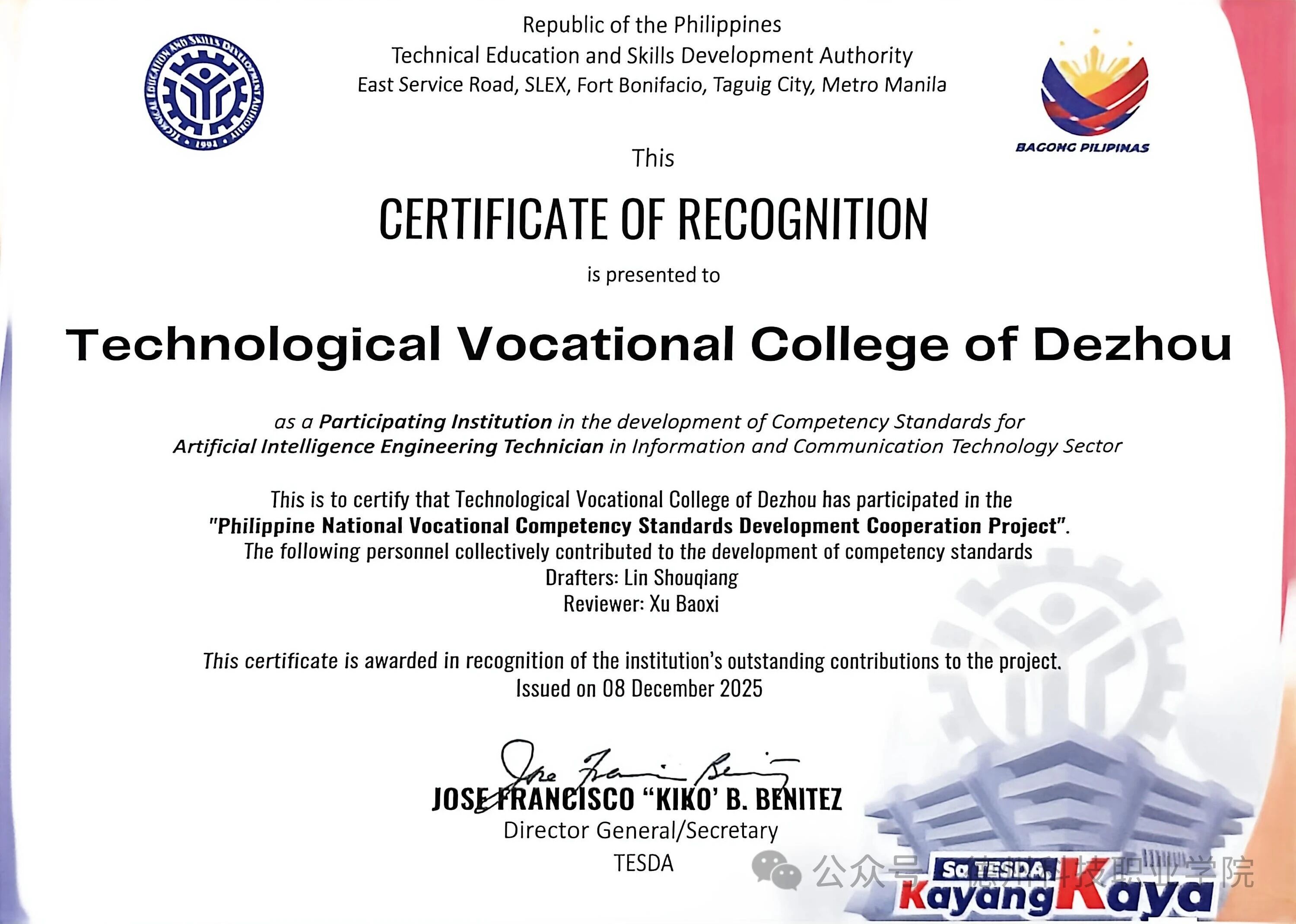 项目成果获得菲律宾职业技术教育与技能发展署官方充分肯定与高度认可,学校成功荣获“菲律宾国家职业技能标准开发单位”,张玲、蔺寿强两位教师获颁标准“起草人”技术专家认证,孙中诺、徐保玺两位教师获颁标准“审定人”技术专家认证。