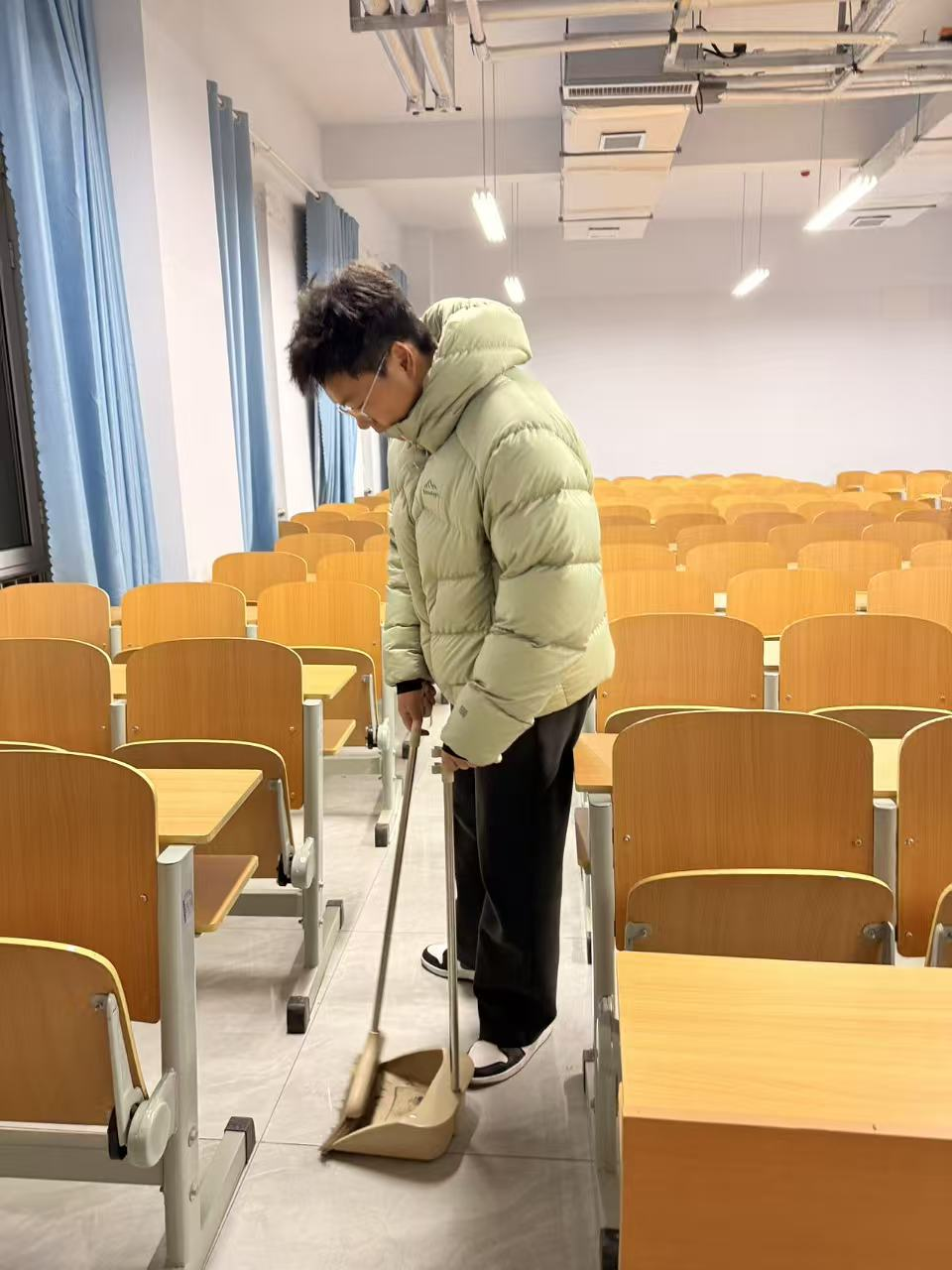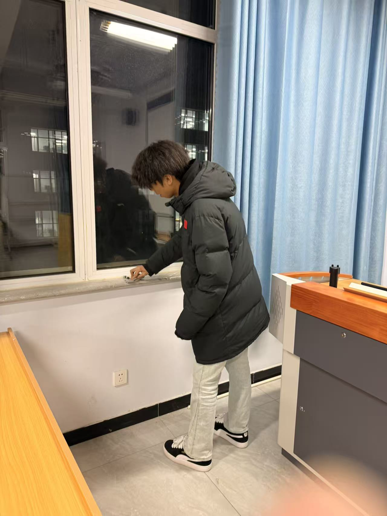 清扫过程中,师生们分工协作、默契配合,展现出饱满的热情与务实的态度。大家手持清扫工具,对教室进行全方位清理:擦拭多媒体屏幕、投影仪等设备时轻拿轻放,细致去除灰尘;清扫地面时采用“先扫后拖”的方式,不放过任何卫生死角;整理课桌椅时将其摆放整齐,擦拭桌面污渍并清理杂物。针对教室角落、窗台缝隙等难以清洁的部位,大家齐心协力逐一攻克,充分彰显了团结协作的精神风貌。