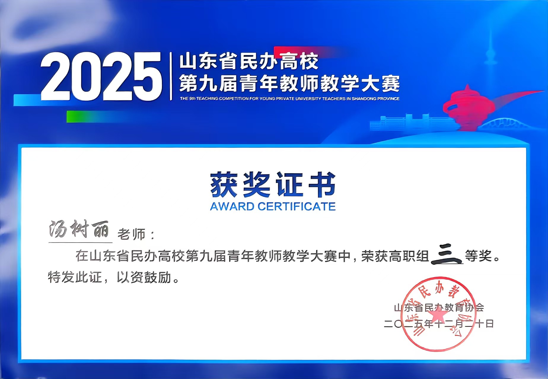 热烈祝贺我校数字经济学院青年教师汤树丽同志,在2025年12月举办的山东省民办高校第九届青年教师教学大赛中,凭借扎实的教学功底、精湛的教学技艺和出色的现场发挥,历经激烈角逐,最终荣获**高职组三等奖**的优异成绩!